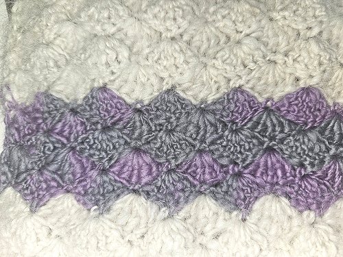 Mjuk, varm halsduk i samojed och merinoull. All ull spunnet på slända och virkad för hand i snäckskalsmönster. Bild 2 visar färgerna bättre än på bild 1.